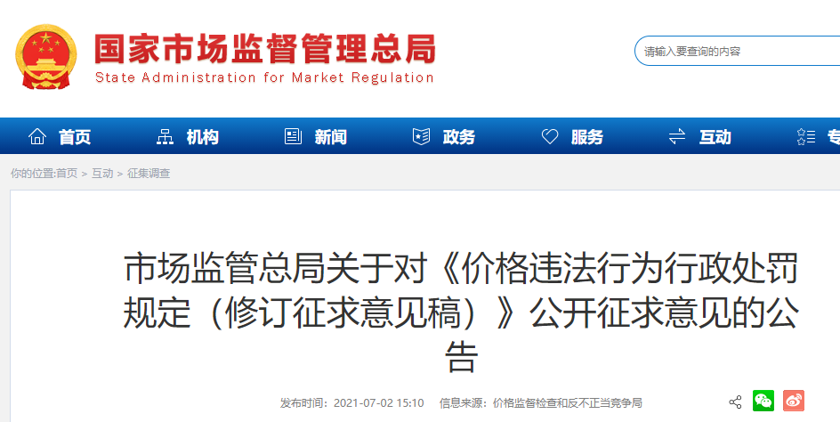 為貫(guan)徹落實(shi)1月20日國務院常務會(hui)議部署,加快修(xiu)(xiu)訂價格(ge)違法行(xing)(xing)為行(xing)(xing)政(zheng)(zheng)(zheng)處罰(fa)等方面法規,及時修(xiu)(xiu)改或廢(fei)除不合理的行(xing)(xing)政(zheng)(zheng)(zheng)處罰(fa)事項,更大激發市場主體(ti)活力(li),市場監管總局(ju)起草了《價格(ge)違法行(xing)(xing)為行(xing)(xing)政(zheng)(zheng)(zheng)處罰(fa)規定(修(xiu)(xiu)訂征(zheng)求(qiu)意(yi)見(jian)稿)》,現向社會(hui)公開征(zheng)求(qiu)意(yi)見(jian)。歡迎各有關單位和個人提出(chu)意見和建議(yi),并于2021年8月2日(ri)前反饋(kui)市(shi)場監管總(zong)局。