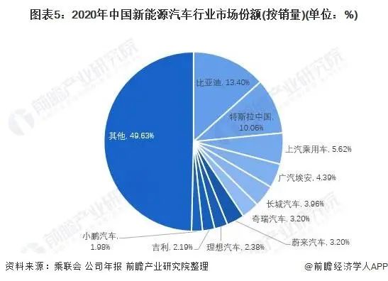 根據中國汽車協會數據顯示,2020年我國新能源汽車銷量為136.7萬輛,同時根據乘聯會和各公司年報提供的新能源汽車銷量得到2020年比亞迪是我國新能源汽車銷量最多的車企,其銷量約占全國新能源汽車銷量的13.40%。由于上汽集團和廣汽集團拆分子公司較多,因此,乘聯會未按照整個集團的新能源汽車銷量來進行排名,其中,這兩家公司新能源汽車的主要子公司上汽乘用車和廣汽埃安分別占我國新能源汽車市場份額的5.62%和4.39%。