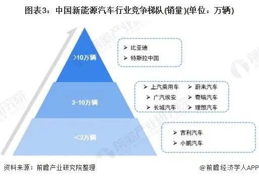 新能源汽車行業依據銷量進行劃分,可分為3個競爭梯隊。其中,銷量大于10萬輛的企業有比亞迪和特斯拉中國;銷量在3-10萬輛之間企業有:上汽乘用車、廣汽埃安、長城汽車、未來汽車、奇瑞汽車和理想汽車。銷量在3萬輛以下的代表性新能源汽車企業有吉利汽車、小鵬汽車等。