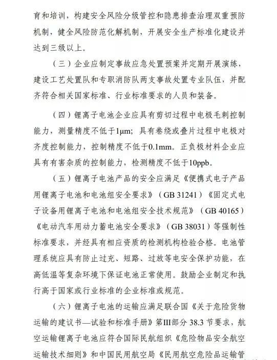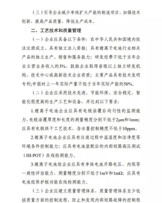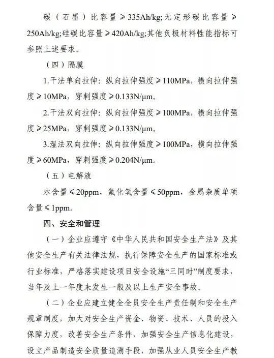 現行的《鋰離(li)子電(dian)池行業規范條(tiao)件》是在(zai)2015年發布(bu)的,已(yi)經(jing)對鋰離(li)子電(dian)池、正極(ji)材(cai)(cai)料、負(fu)極(ji)材(cai)(cai)料、隔膜、電(dian)解液生產企(qi)業提(ti)出了產業布(bu)局和項目設(she)立、工藝技術和質量管(guan)(guan)理(li)、產品(pin)性能、安全(quan)管(guan)(guan)理(li)的相關(guan)要(yao)(yao)求,不過在(zai)最新的意見(jian)稿中,相關(guan)要(yao)(yao)求都明顯嚴格了許多(duo)。