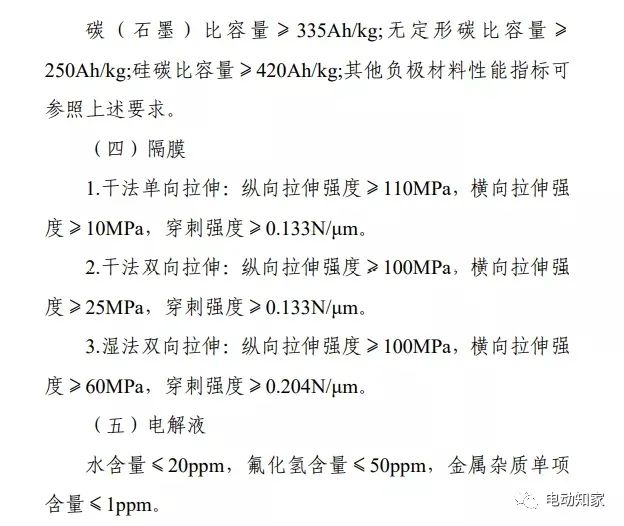 儲能電(dian)池方(fang)面(mian),《規(gui)范條件(2021)》也要(yao)求單體能量(liang)(liang)密度≥145Wh/kg,電(dian)池組能量(liang)(liang)密度≥110Wh/kg。循環壽命方(fang)面(mian),要(yao)求≥5000次且容量(liang)(liang)保(bao)持率(lv)≥80%。值得(de)注意的(de)是(shi),《規(gui)范條件(2021)》還(huan)對(dui)正極(ji)材(cai)料(liao)(liao)、負極(ji)材(cai)料(liao)(liao)、電(dian)解液、隔膜(mo)等擴建項目產品(pin)性能進行(xing)了要(yao)求。正極(ji)材(cai)料(liao)(liao)方(fang)面(mian),要(yao)求磷酸鐵鋰(li)比容量(liang)(liang)≥150Ah/kg;三元材(cai)料(liao)(liao)比容量(liang)(liang)≥175Ah/kg;鈷(gu)酸鋰(li)比容量(liang)(liang)≥170Ah/kg;錳(meng)酸鋰(li)比容量(liang)(liang)≥115Ah/kg。負極(ji)材(cai)料(liao)(liao)方(fang)面(mian),碳(石(shi)墨)比容量(liang)(liang)≥335Ah/kg;無定形碳比容量(liang)(liang)≥250Ah/kg;硅碳比容量(liang)(liang)≥420Ah/kg。 電(dian)解液方(fang)面(mian),水含(han)量(liang)(liang)≤20ppm,氟(fu)化氫含(han)量(liang)(liang)≤50ppm,金屬雜質單項含(han)量(liang)(liang)≤1ppm。