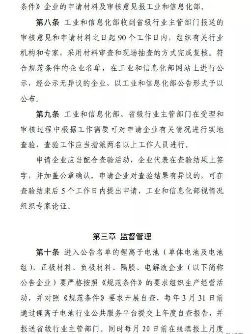 上一(yi)版規(gui)(gui)范條(tiao)(tiao)(tiao)件提(ti)出,汽(qi)車(che)用(yong)鋰(li)(li)離(li)子(zi)(zi)動(dong)力(li)(li)電(dian)池(chi)(chi)除滿足(zu)本(ben)規(gui)(gui)范條(tiao)(tiao)(tiao)件要(yao)求(qiu)外,還需滿足(zu)《汽(qi)車(che)動(dong)力(li)(li)蓄(xu)電(dian)池(chi)(chi)行(xing)業(ye)規(gui)(gui)范條(tiao)(tiao)(tiao)件》要(yao)求(qiu),按照當初的(de)規(gui)(gui)定,整車(che)企(qi)業(ye)只(zhi)有采用(yong)進入了《汽(qi)車(che)動(dong)力(li)(li)蓄(xu)電(dian)池(chi)(chi)行(xing)業(ye)規(gui)(gui)范條(tiao)(tiao)(tiao)件》目(mu)錄中的(de)電(dian)池(chi)(chi)企(qi)業(ye)的(de)電(dian)池(chi)(chi)才有進入新能源汽(qi)車(che)推薦目(mu)錄,才有獲得補(bu)貼的(de)資格,不(bu)過(guo)該文(wen)件已經在2019年被(bei)工信部廢(fei)止。也就(jiu)是說,現行(xing)關(guan)于(yu)鋰(li)(li)離(li)子(zi)(zi)電(dian)池(chi)(chi)行(xing)業(ye)管理(li)的(de)政策主要(yao)就(jiu)是《鋰(li)(li)離(li)子(zi)(zi)電(dian)池(chi)(chi)行(xing)業(ye)規(gui)(gui)范條(tiao)(tiao)(tiao)件》,最新的(de)文(wen)件也為企(qi)業(ye)指明了方向,不(bu)過(guo)目(mu)前(qian)還處于(yu)征求(qiu)意見的(de)階段。