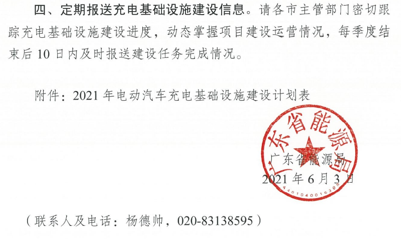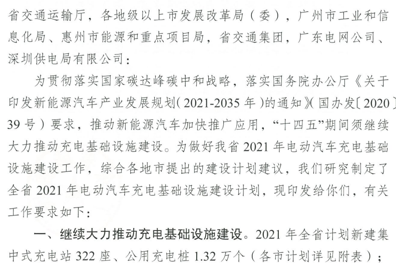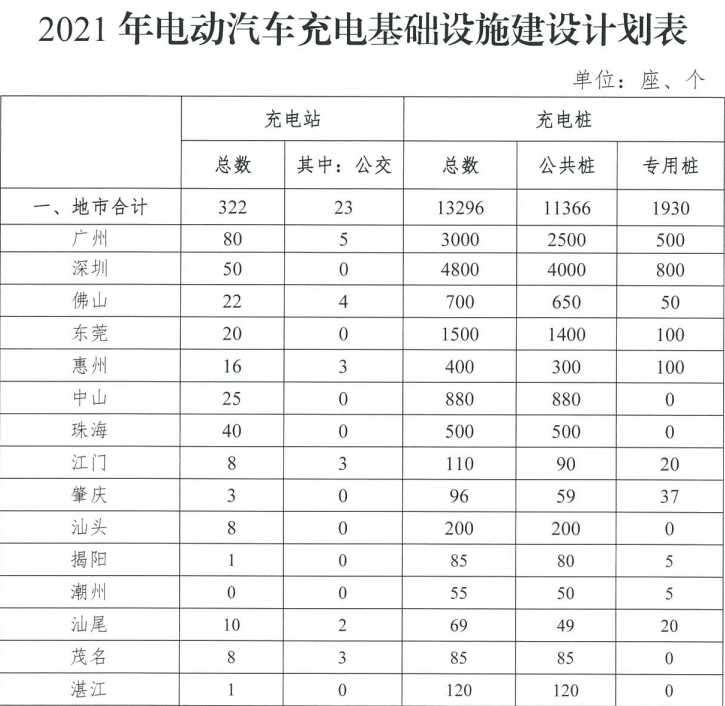 日前,廣東省能源局關于印發《2021年電動汽車充電基礎設施建設任務的通知》,通知顯示,2021年廣東省計劃新建集中式充電站322座,公用充電樁1.32萬個;高速公路快充站15座。并給出全省各地市建設計劃詳細分解表(表格見(jian)文后)。